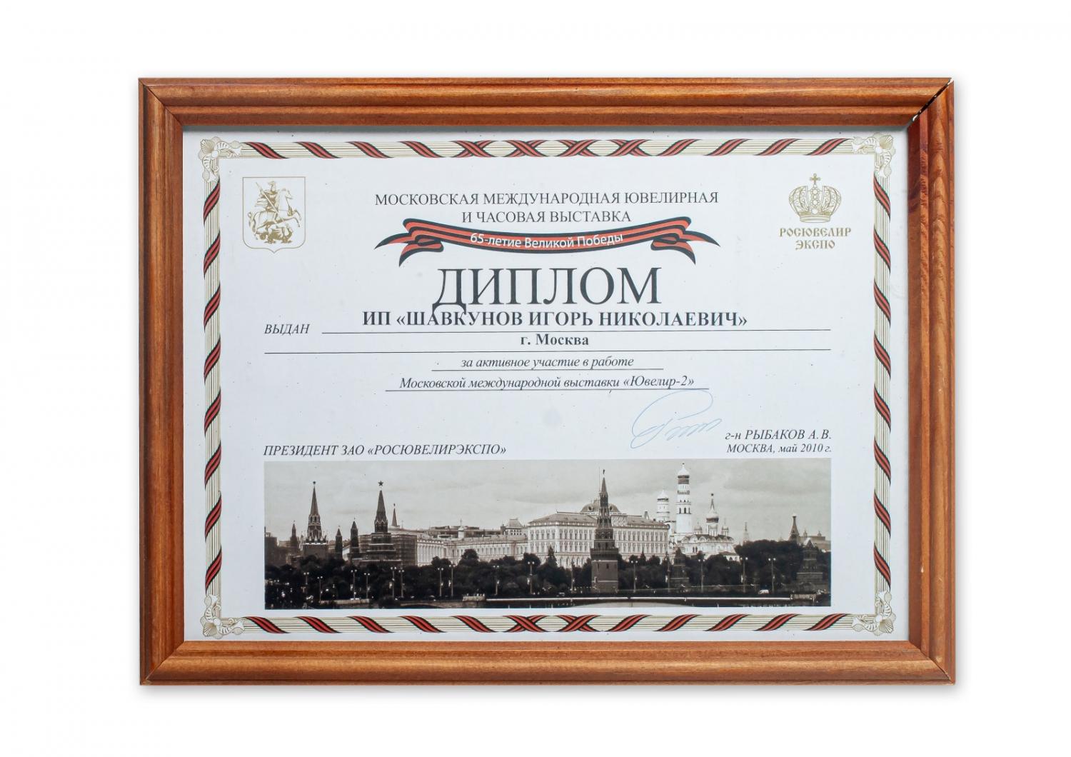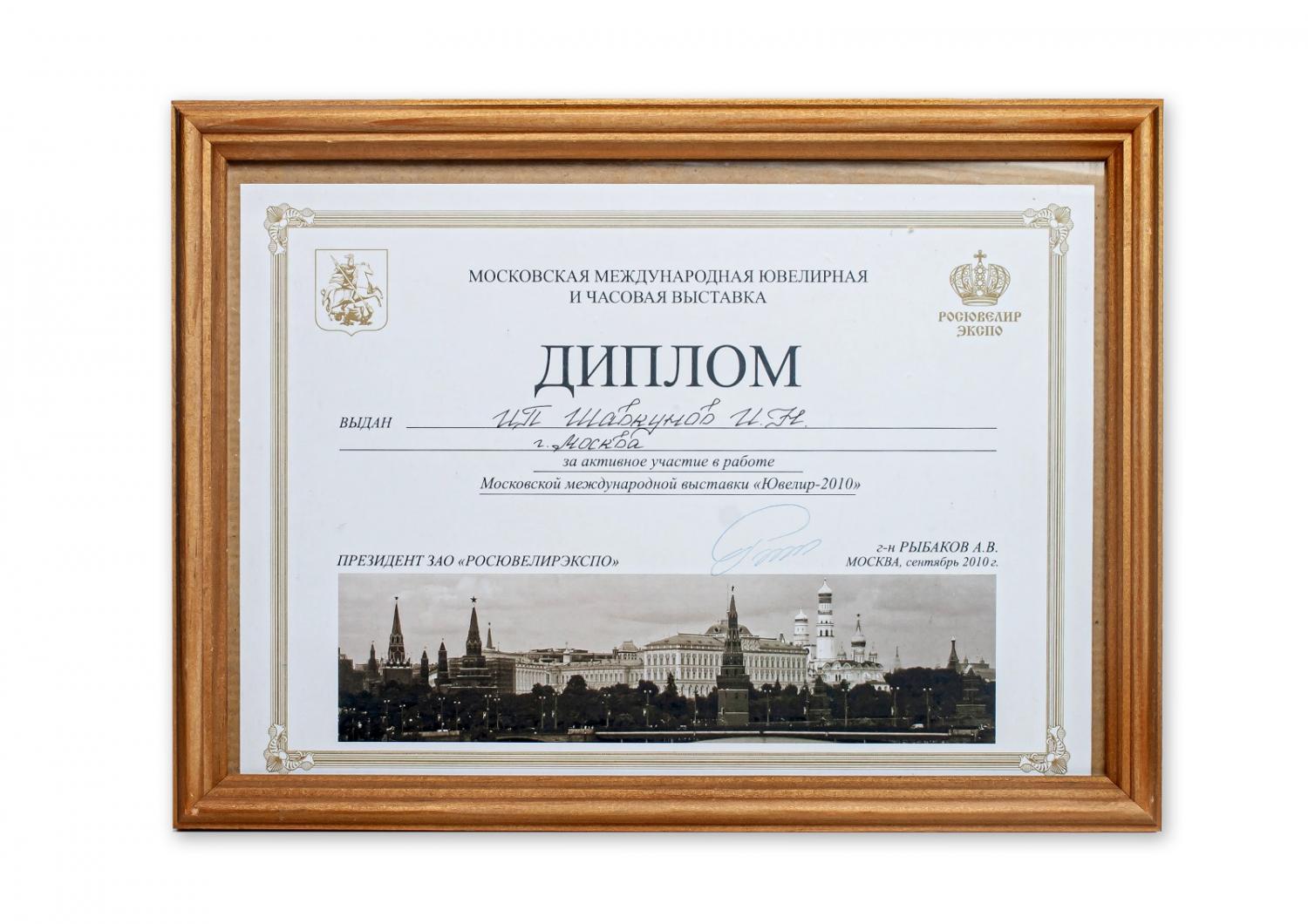 Диплом за активное участие в работе Московской международной выставке "Ювелир-2" (2010 г.)