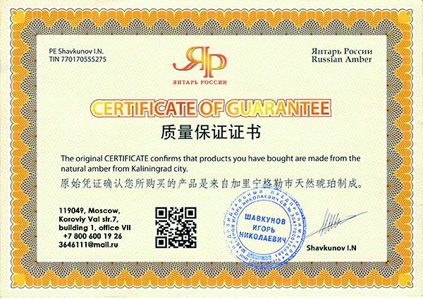 Гарантийный сертификат подтверждающий что изделия изготовлены из натурального Калининградского янтаря