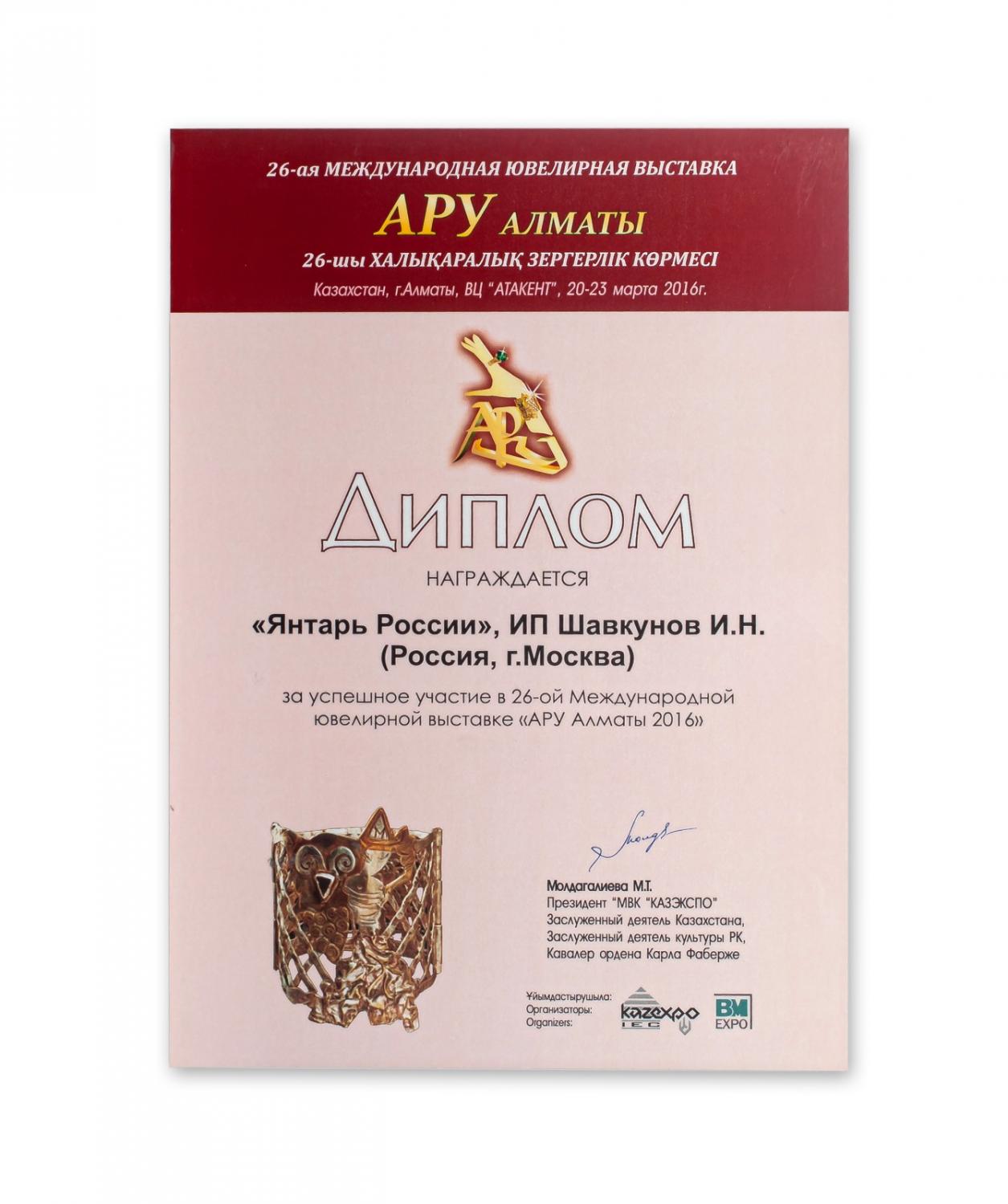 Диплом за успешное участие в 26-ой Международной ювелирной выставке "Ару-Алматы 2016"