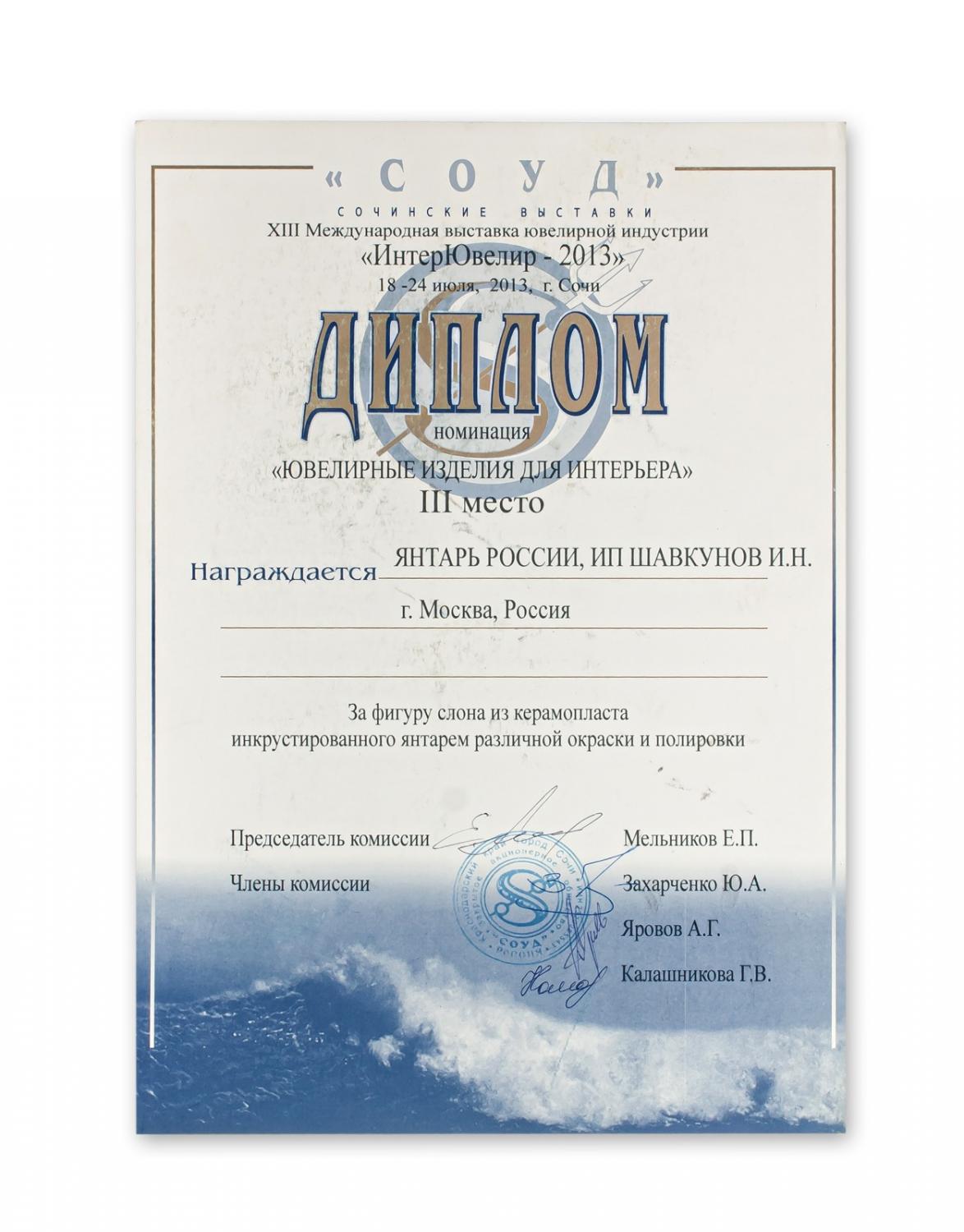 Диплом за фигуру слона из керамопласта инкрустированного янтарем различной окраски и полировки