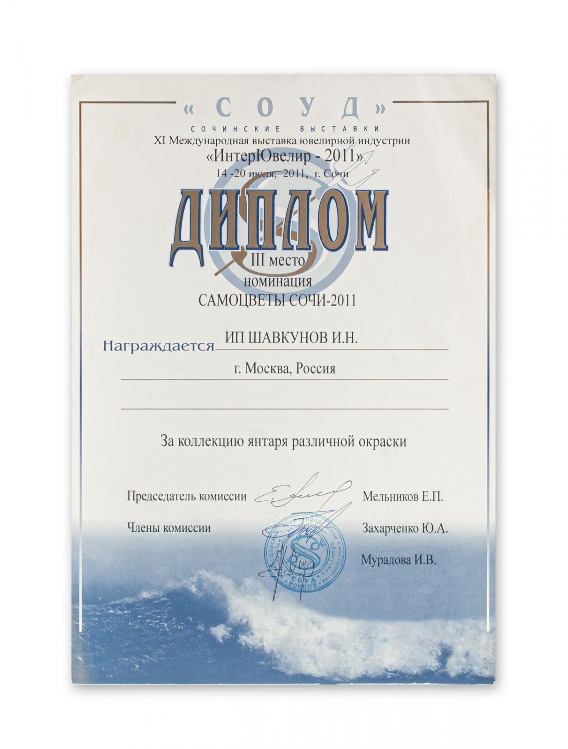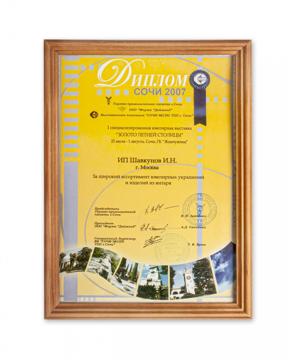 Диплом за широкий ассортимент ювелирных украшений и изделий из янтаря