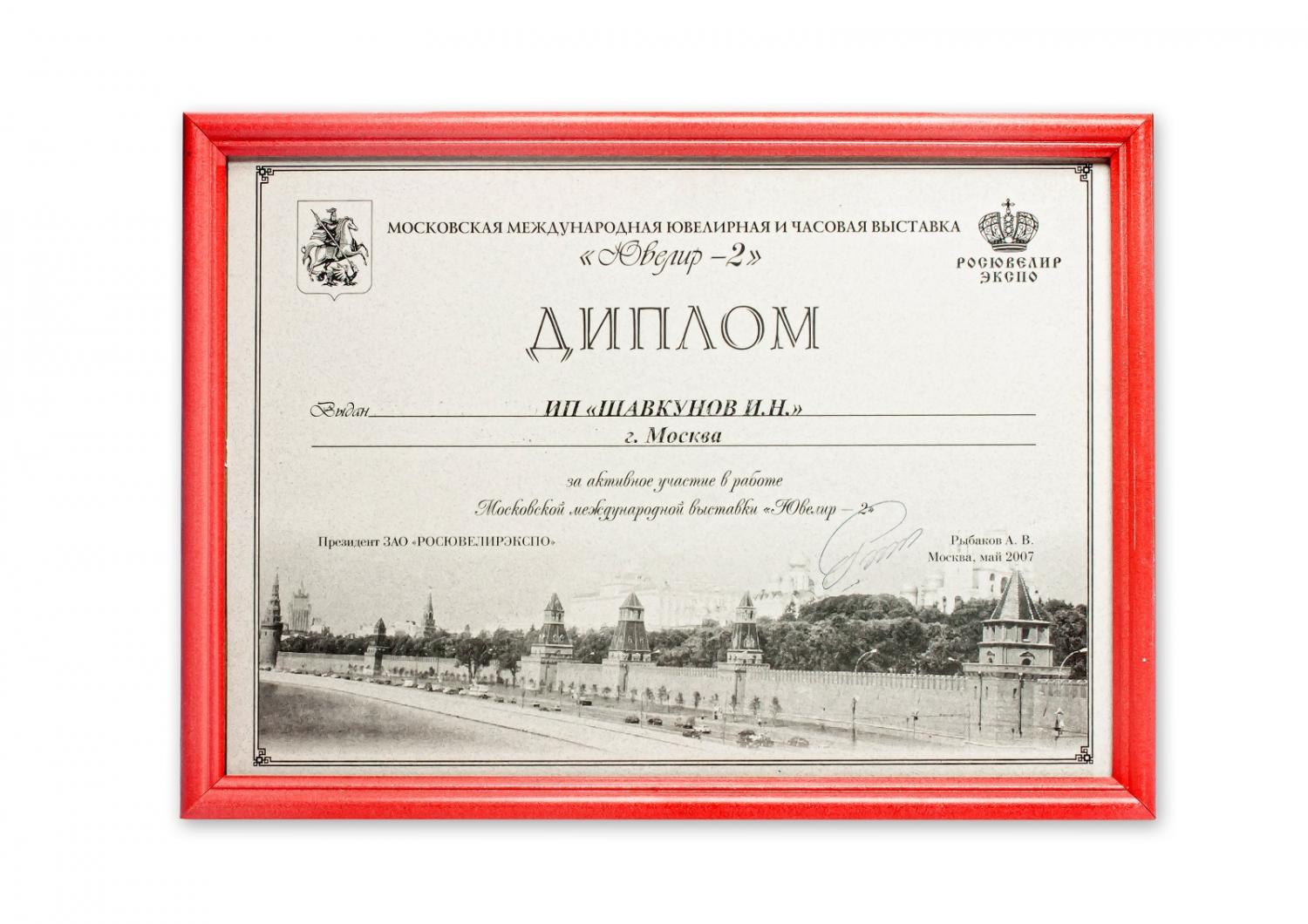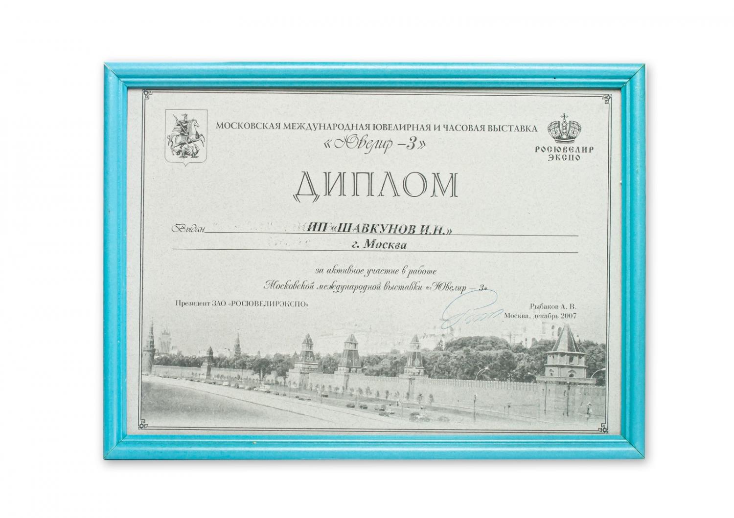Диплом за активное участие в работе Московской международной выставке "Ювелир-2007"