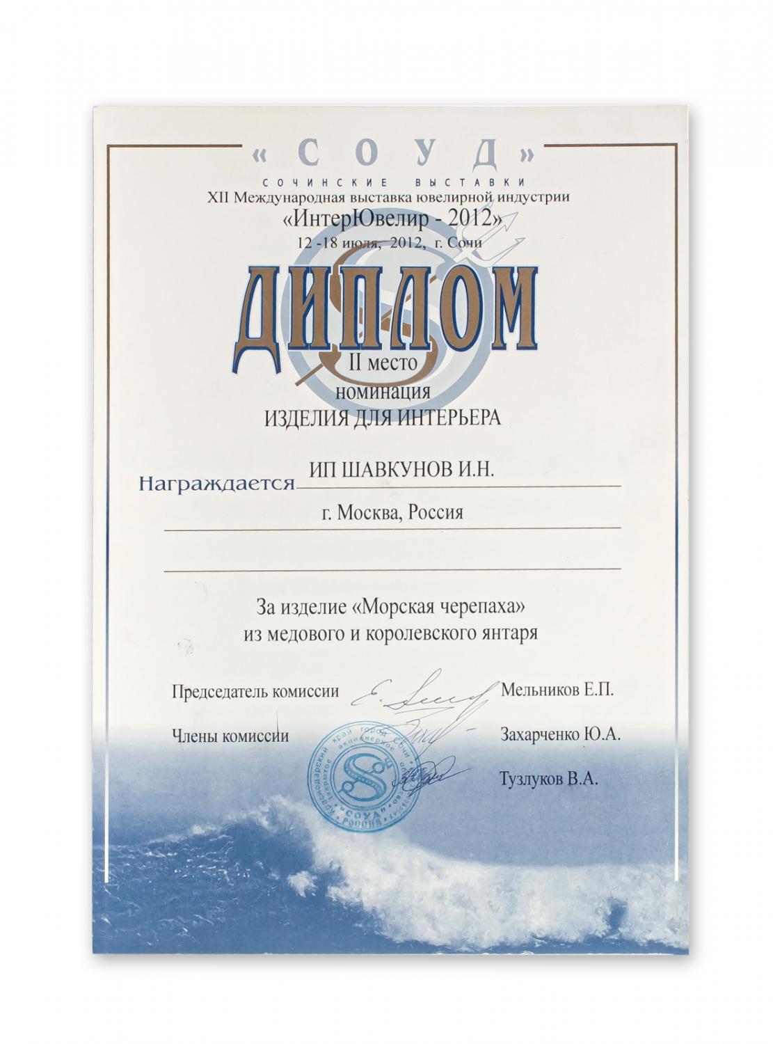 Диплом за изделие "Морская черепаха" из медового и королевского янтаря