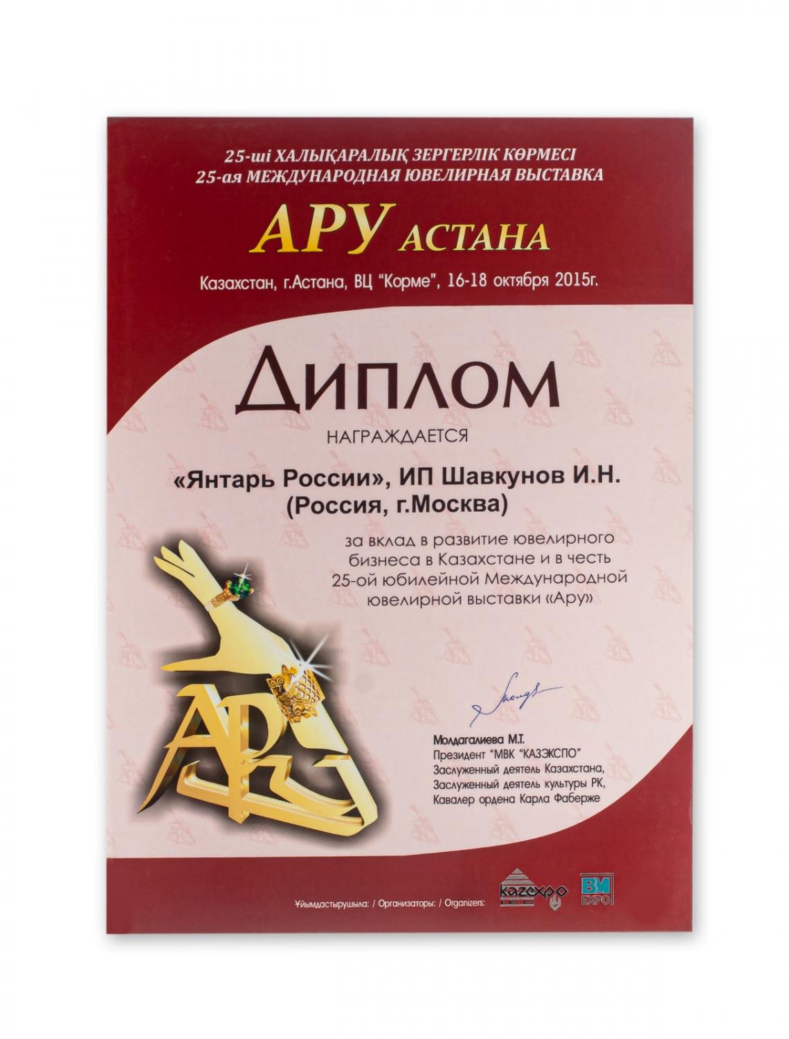 Диплом за вклад в развитие ювелирного бизнеса в Казахстане и в честь 25-ой юбилейной Международной выставки "Ару"