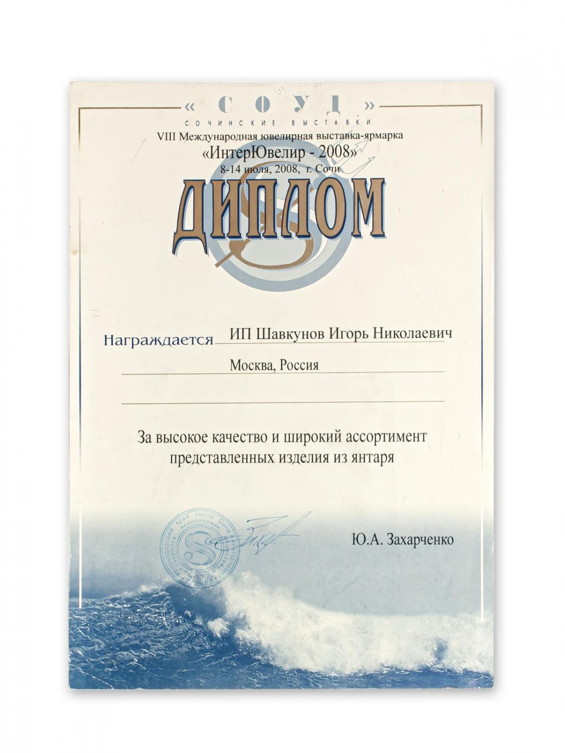 Диплом за высокое качество и широкий ассортимент представленных изделий из янтаря